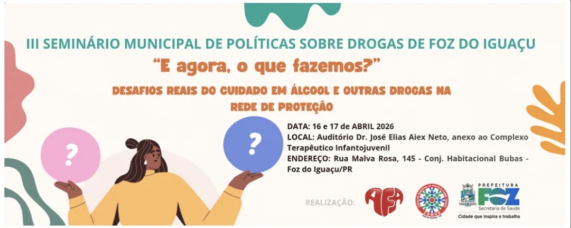 No primeiro dia do seminário, as atividades são para profissionais das áreas de saúde, assistência social, educação, sistema de justiça e organizações da sociedade civil. O foco está no fortalecimento da rede de proteção e na troca de experiências. Para participar, é necessário realizar inscrição on-line (III SEMINÁRIO MUNICIPAL DE POLÍTICAS SOBRE DROGAS DE FOZ DO IGUAÇU).